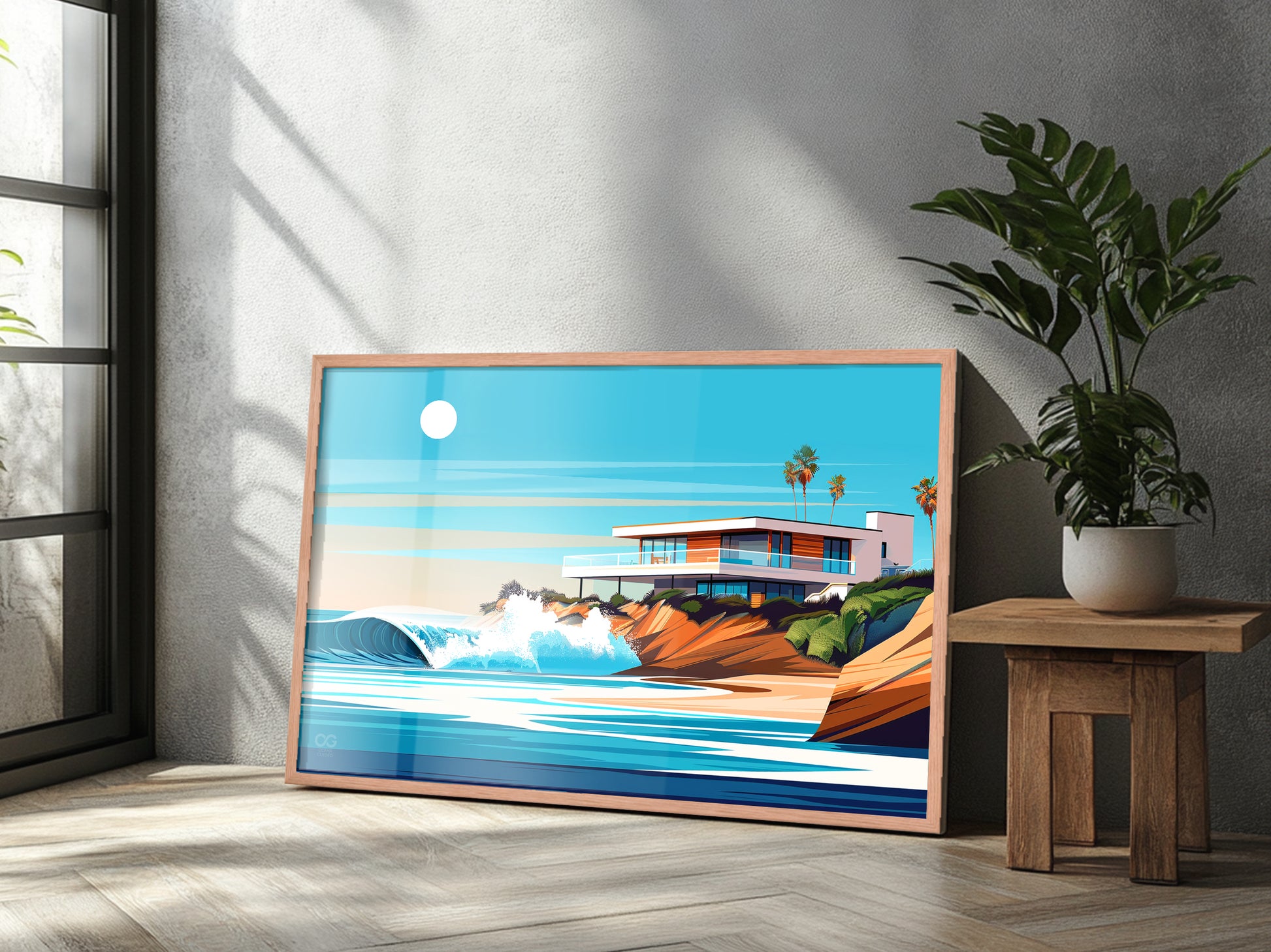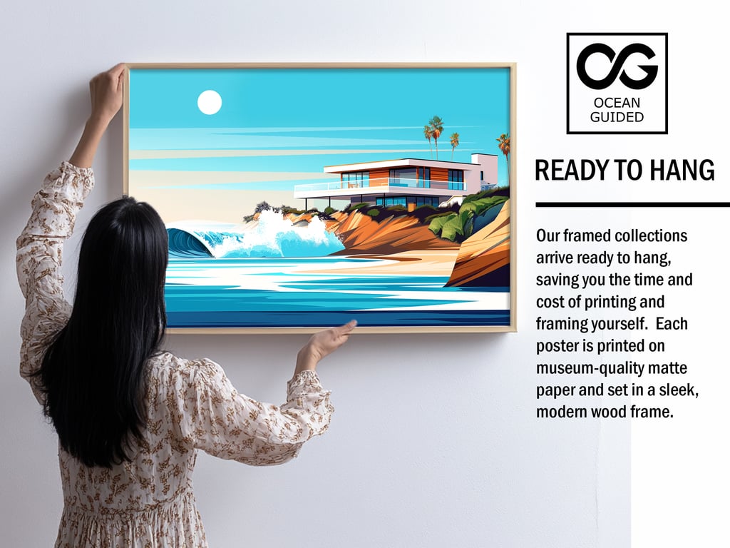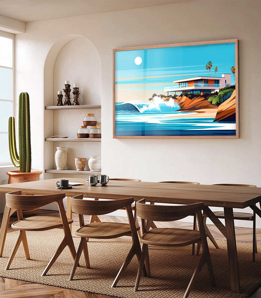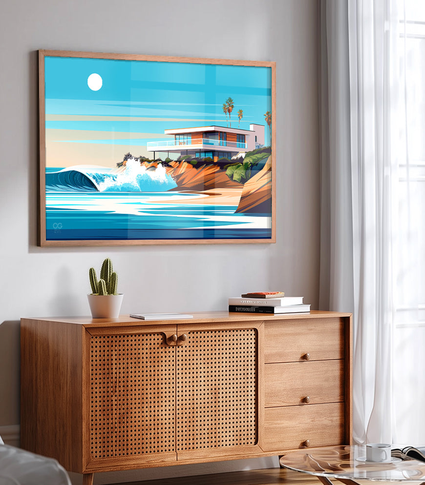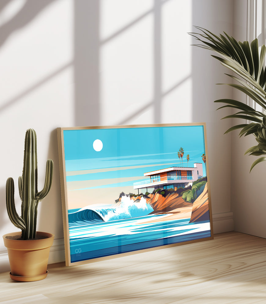 🌊 la Jolla Experience the mesmerizing allure of "La Jolla" in this vibrant surf art print. The artwork captures a dynamic wave, its aquamarine body cresting against the warm, sandy coastline, bathed in the soft glow of the sun. The modern house located on this private point break is a surfer's dream. This print brings the raw power and tranquil beauty of La Jolla's seascape into your living space.