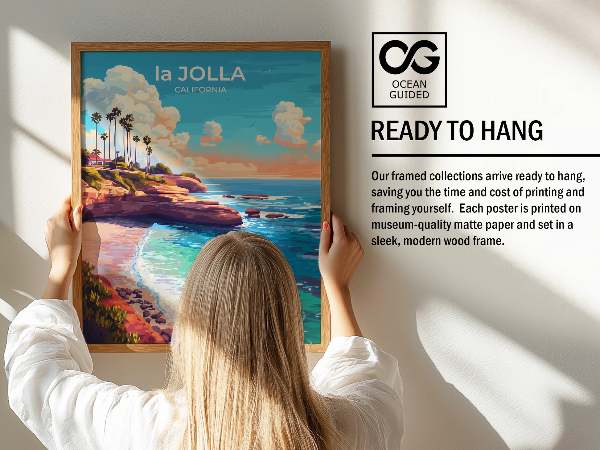 🌊 la Jolla 1 "La Jolla 1" captures the serene beauty of a coastal paradise. The artwork highlights the azure ocean against a soft, pastel sky, while palm-lined streets and distant homes add warm, inviting tones. The crisp light cascading over the cliffs and coves reveals a captivating contrast of shadows and brightness. This piece transports you to La Jolla's tranquil beaches, immersing you in its calming atmosphere.